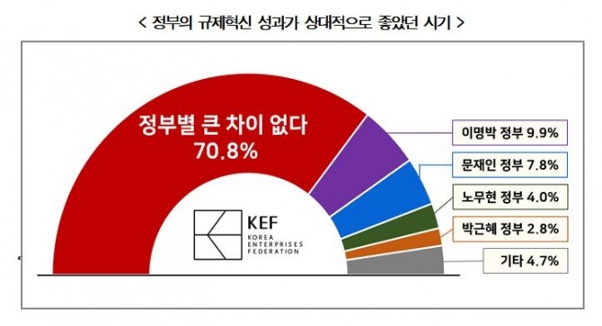 규제혁신 성과가 가장 좋았던 시기를 묻는 질문에는 70.8%가 '정부별로 큰 차이가 없다'고 했다.