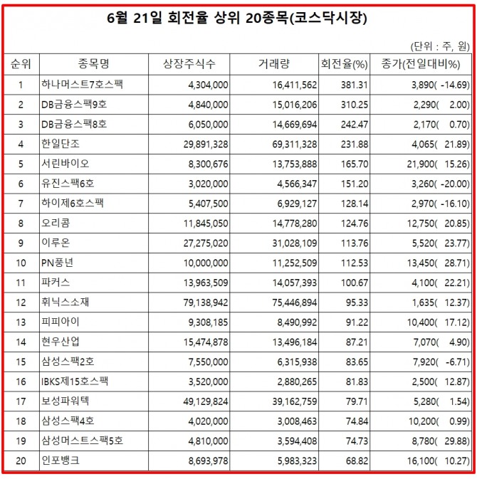 21일 주식시장에서 코스닥 종목의 거래량 회전율 기준 상위 종목은 다음과 같다.