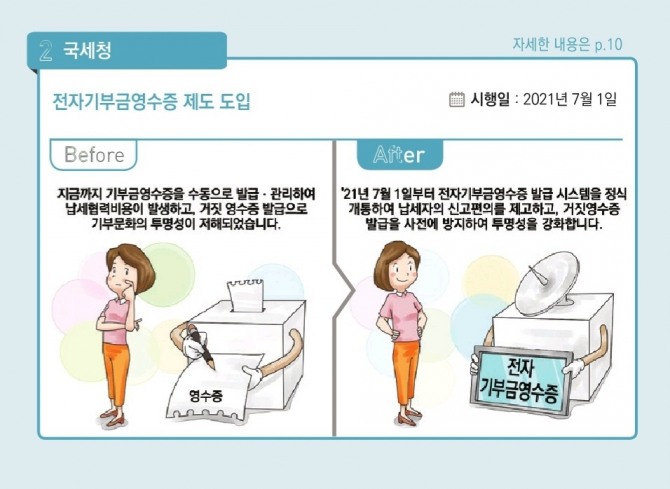 기획재정부가 28일 내놓은 국세청 소관 '2021년 하반기부터 이렇게 달라집니다' 책자에 따르면 다음 달부터 홈택스에서 전자기부금 영수증 발급 시스템이 운영된다.