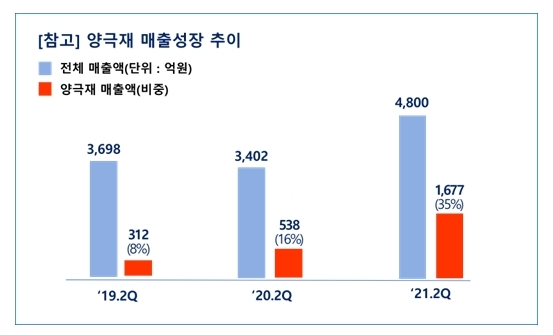 이미지 확대보기양극재 매출액은 지난 2019년 2분기 312억 원에서 2020년 2분기 538억 원으로 확대돼, 총 매출액에서 차지하는 비출이 8%에서 16%로 증가했다. 그리고 올해 2분기에는 1677억 원으로 총 매출액에서 35%를 차지했다.