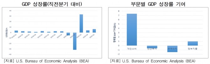 지난 6월 24일 확정치로 발표된 1분기 실질 GDP 성장률은 전 분기 대비 연율 6.4% 성장했다. 항목별로는 개인소비와 정부지출이 크게 증대해 민간투자 및 무역수지의 부진을 상쇄했다. 지난 4월에 경기부양 목적으로 개인 지급된 현금 보조금에 힘입어 자동차(전기 대비 13.4%), 가구(10.5%), 의류(7.8%) 등 판매가 증가했고 백신 접종확산에 따른 여가(8.3%) 및 요식(6.0%) 서비스 분야 지출도 크게 확대됐다.