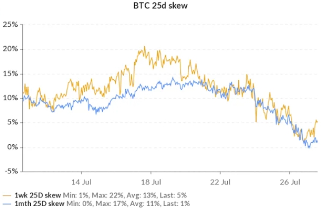 이런 가운데 콜 매수 호황으로 단기 스큐가 회복되고 있는 것으로 나타났다. 지난주 금요일에 거래자는 OTC 데스크 패러다임을 통해 비트코인에 대한 총 2,000개의 콜 옵션 계약을 100개 클립으로 여러 개 구매했다. 매수는 행사가 3만3,000달러, 3만4,000달러, 3만5,000달러인 7월 30일 만기 콜에 집중됐다. 또 트레이더들은 8월 6일 만기 콜을 3만4,000달러, 3만5,000달러, 3만6,000달러 행사가로 매수했다.