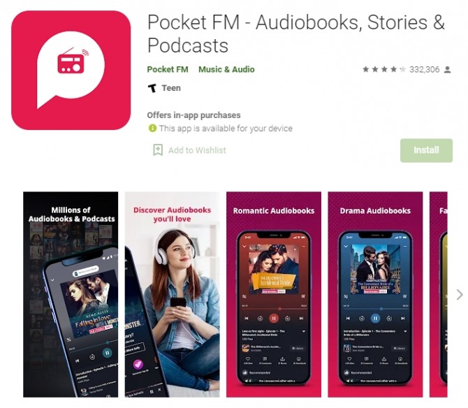 포켓 FM은 현재 팟캐스트와 오디오북 서비스를 영어와 인도어 등으로 제공하고 있는 인기 앱이다.