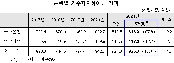 이미지 확대보기14일 한국은행이 발표한 2021년 8월중 거주자외화예금 동향에 따르면, 현재 외국환은행의 거주자외화예금은 926억 달러로 7월 말에 비해 4억7000만 달러 증가했다.