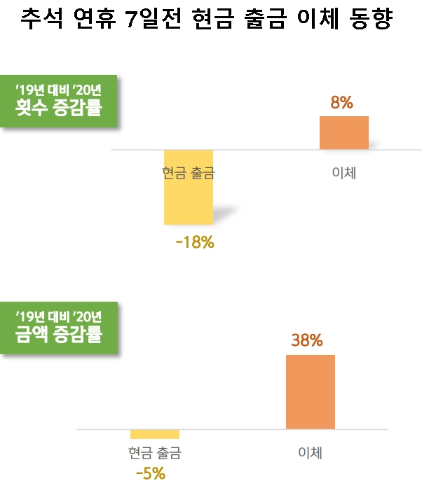14일 신한은행 트렌드 리포트 '눈치코치 금융생활 – 추석엔 어떤 일이?'에 따르면, 지난해 추석 연휴 7일전 현금 출금 횟수는 2019년에 비해 18% 감소하고 금액은 5% 줄었다. 반면 이체 횟수는 8%, 금액은 38% 급증한 것으로 나타났다.