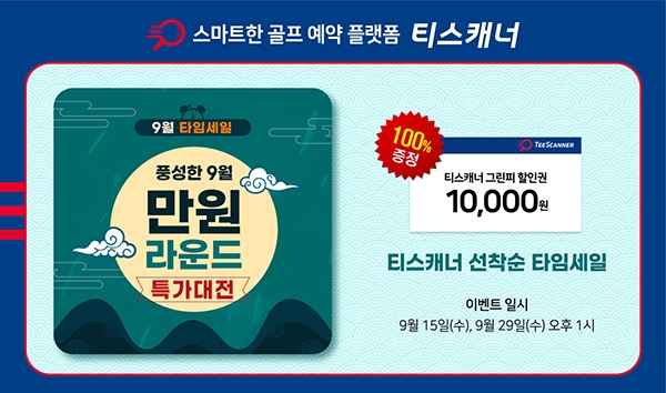스마트한 골프 예약 플랫폼인 '티스캐너'는 본격 골프 성수기 가을을 맞아 최대 그린피 1만 원대로 라운드를 떠날 수 있는 9월 타임세일 모바일 앱(APP) 전용 이벤트를 진행한다고 14일 밝혔다.타임세일 이벤트는 티스캐너가 고객들에게 감사한 마음을 전하고자 4년 간 매달 꾸준히 진행하고 있는 시그니처 프로모션으로, 최대 95% 할인을 통해 1만 원대의 그린피를 만나볼 수 있어 높은 인기를 자랑하는 이벤트 중 하나이다.