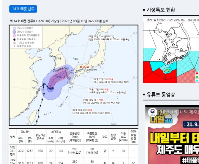 이미지 확대보기기상청은 16일 오늘날씨 전국 예보에서 제14호 태풍 '찬투(CHANTHU)'는 03시 현재, 서귀포 남남서쪽 약 370km 부근 해상에서 시속 10km로 서진하고 있다고 밝혔다. 이 태풍은 오늘(16일) 제주도남쪽해상을 지나 내일(17일) 대한해협을 통과할 것으로 예상된다. 제주도와 남부지방은 태풍의 영향을 받겠다.