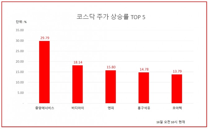 16일 한국거래소에 따르면 이날 코스닥 시장에서 중앙에너비스는 상한가를 기록했다. 흥구석유도 14.78% 상승했다.