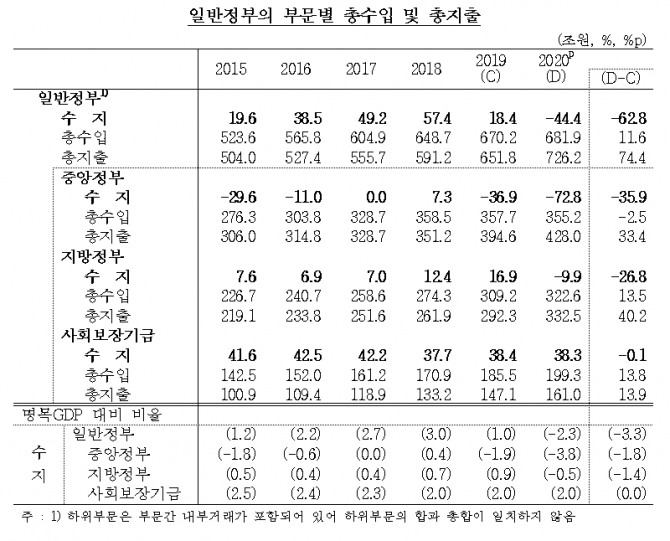 이에 따라 중앙·지방정부, 사회보장기금을 모두 포함한 일반정부 수지는 44조 4천억 원의 적자로 집계됐다.
