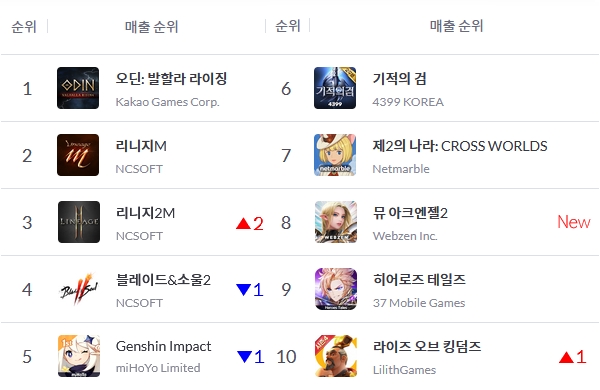 이미지 확대보기카카오게임즈 '오딘: 발할라 라이징', NC '리니지M'은 17일 기준 구글 플레이스토어 1, 2위를 오랜기간 사수하고 있다. '블레이드 앤 소울(블소) 2'와 미호요 '원신'은 1계단 씩 순위가 떨어졌고 '리니지2M'이 2주만에 3위를 되찾았다.