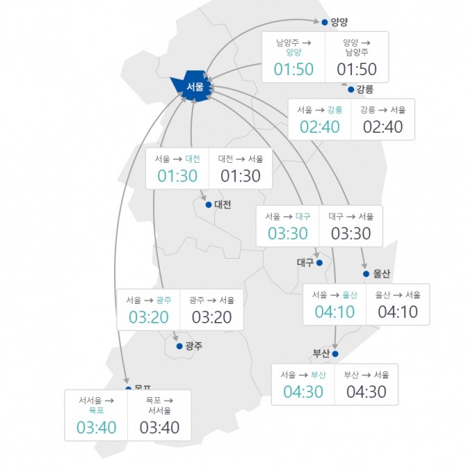 오후 6시 출발 기준 주요 도시간 예상 소요시간은 서울 기준으로 부산까지 4시간30분, 대전까지 1시간50분, 광주까지 3시간20분, 대구까지 3시간30분, 강릉까지 2시간40분 가량이다.