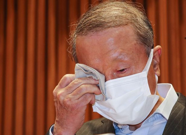 홍원식 남양유업 회장이 지난 5월 4일 대국민 사과를 하다가 눈물을 흘리고 있다. 23일 남양유업과 LKB앤파트너스에 따르면 따르면 홍 회장은 한앤코를 상대로 손해배상 청구 소송을 제기했다. 사진=연합뉴스