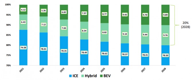 자동차의 파워 트레인(Power Train)은 크게 내연기관(Internal combustion engine, ICE), 하이브리드(Hybrid), 배터리 전기차(Battery Electric Vehicle, BEV)로 나눌 수 있다. 자동차 산업 전문 시장조사기관 Auto Forecast Solutions(AFS)의 6월 리서치에 따르면, 올해 87.6%는 내연기관차, 7.6%는 하이브리드, 4.8%는 배터리 전기차일 것으로 전망했다. 2028년이 되면 각각의 점유율은 78.5%, 9.9%, 10.1%가 될 것으로 전망하며, 내연기관차의 비중은 점차 줄어들고 친환경 자동차의 비중은 약 20%에 도달할 것을 예상했다. 이러한 변화의 주요한 요인으로 ① 2050년까지 전 세계 탄소 중립성을 달성하기 위한 정부의 임무와 정책 ② 이에 따른 대형 OEM들의 전기 자동차 생산 계획을 들 수 있다.