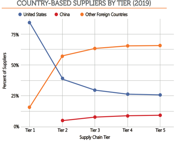 미 국방부는 미군의 군수품의 중요도에 따라 공급업체를 5개 티어(tier)로 구분하고 있다. 미국의 군사 데이터 분석업체인 가비니(Govini)가 발표한 자료에 따르면, 티어 1(중요도가 가장 높음)에 해당하는 미국 기업의 공급률은 84%, 티어 2~5에 해당하는 외국기업의 공급률은 70%로 나타났다. 티어 2에 해당하는 미국 기업의 공급률은 50% 이하로 나타났으며 티어 3~5에 해당하는 미국 기업의 공급률은 약 25% 수준인 것으로 분석되었다. 중국 기업의 공급률은 티어 1의 경우 0% 였지만, 티어 2의 경우 5%, 티어 5의 경우 9%까지 증가하고 있는 것으로 분석되었다.