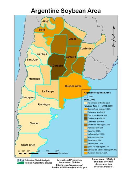 아르헨티나 로사리오곡물거래소(BCR)에 따르면, 아르헨티나는 2019~20년 생산연도에 1690만 헥타르에서 4500만t의 콩을 생산했고 이번 생산연도인 2021~22년에는 162만 헥타르에서 약 4880만t을 생산할 것으로 예상되고 있다.올해 콩재배면적은 15년 사이에 가장 적은 것이다.