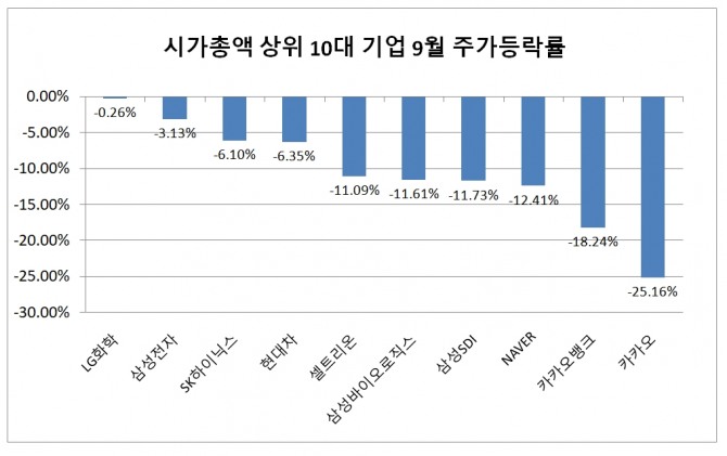 이외에도 셀트리온, 삼성바이오로직스, 삼성SDI, 네이버 등도 10% 대 하락률을 기록하며 부진한 모습을 보이고 있다.