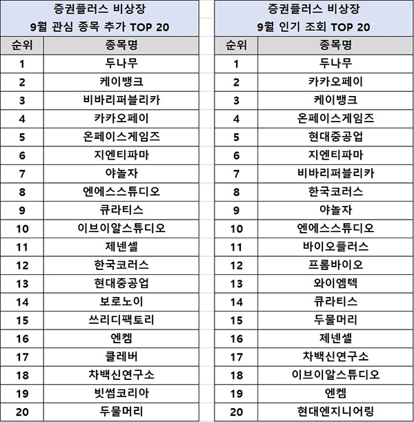 두나무(대표 이석우)가 국내 비상장 주식 통합 거래 플랫폼 '증권플러스 비상장'에서 9월 한 달간 인기를 끈 비상장 주식 키워드를 7일 발표했다.지난 8월에 이어 9월에도 핀테크 주의 약진이 두드러져, 케이뱅크, 카카오페이, 두나무, 비바리퍼블리카 등 주요 핀테크 주 중심으로 상위권이 재편되는 양상을 보였다. 비상장 주식 시장의 스테디셀러로 자리잡은 바이오 주는 9월에도 꾸준한 인기를 이어가고 있다.