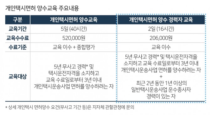 개인택시면허 양수교육은 여객자동차 운수사업법 시행규칙에 의거해 사업용 자동차 운전경력을 대체하기 위한 일종의 경력보수교육이다.
