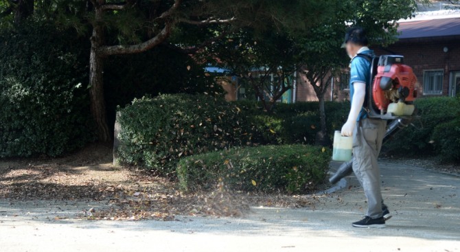 완연한 가을 날씨가 이어지고 있는 14일 전북 전주시 전주덕진공원에서 한 관계자가 송풍기로 낙엽을 쓸어내고 있다. 사진=뉴시스