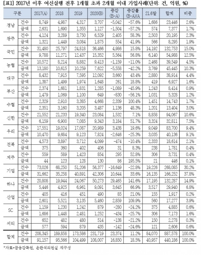 국민은행에 이어 농협은행의 꺾기의심 거래도 많았다. 지난 4년 반 동안 4조 5445억 원, 3만 9549건 규모로 꺾기 의심거래가 이뤄졌다. 다만 2017년 1조 3180억 원에서 2020년 7622억 원으로 4년간 42.2%나 감소했다.