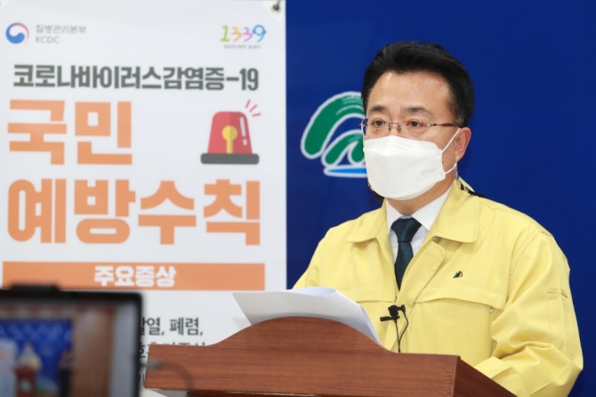 서승우 충북도 행정부지사가 17일 도청에서 비대면 온라인 브리핑으로 사회적 거리두기 3단계 연장과 일부 시·군의 4단계 기준 적용 등을 설명하고 있다. 사진=뉴시스이미지 확대보기
