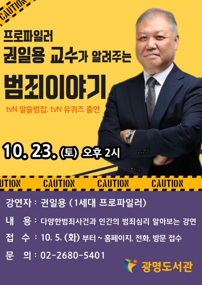 광명시 광명도서관은 오는 10월 23일 오후 2시 ‘프로파일러 권일용 교수 초청 강연회’를 온라인으로 개최한다.