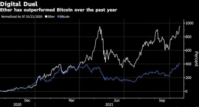 그래픽은 2020년 10월 이후 비트코인과 이더리움의 가격 변동 추이.이미지 확대보기