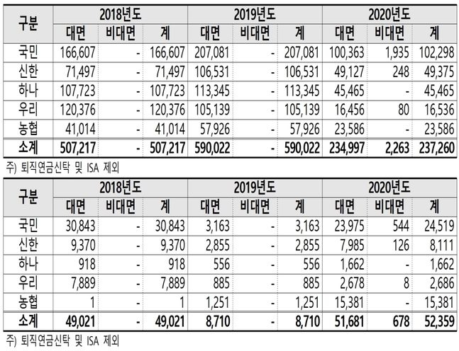 이미지 확대보기21일 국회 정무위 소속 윤관석 더불어민주당 의원이 금감원에서 받은 자료에 따르면, 3년간 국민은행은 5조 8524억 원의 ETF편입 신탁을 팔아 558억원 의 수수료를 챙겼다. 신한은행은 2조 337억 원을 팔아 99억 원의 수수료를 받았으며 하나은행은 3136억 원을 팔아 29억 원의 수수료를 거뒀다. 우리은행은 1조 6632억 원을 팔아 116억 원의 수수료를 챙겼으며 농협은행은 1조 6632억원 을 팔아 41억 원의 수수료를 받은 것으로 나타났다.