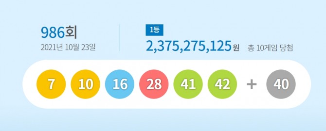 당첨번호 6개를 모두 맞힌 1등 당첨자는 10명이 나왔으며 각각 23억 7528만 원씩 받는다.