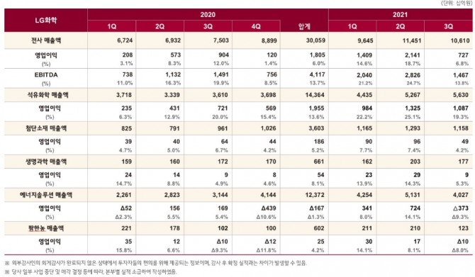 이미지 확대보기LG화학은 올해 3분기 매출액 10조6102억 원, 영업이익 7266억 원의 경영실적을 달성했다고 25일 밝혔다.