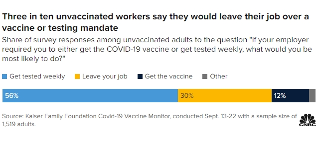 카이저패밀리재단의 최근 여론조사 결과. 응답자의 30%가 백신 접종 의무화가 이뤄지면 퇴사할 의향이 있다고 밝혔다. 사진=카이저패밀리재단/CNBC