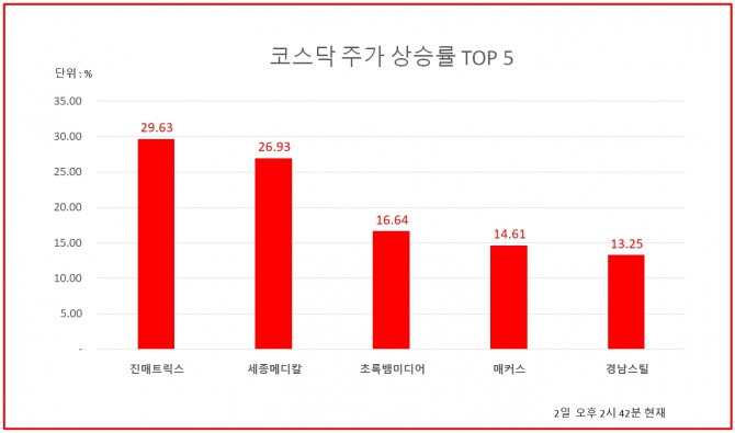 뒤를 이어 세종메디칼이 20% 넘게 상승했고, 초록뱀미디어도 15% 넘게 상승하며 코스닥 시장 상승률 상위권에 이름을 올렸다.