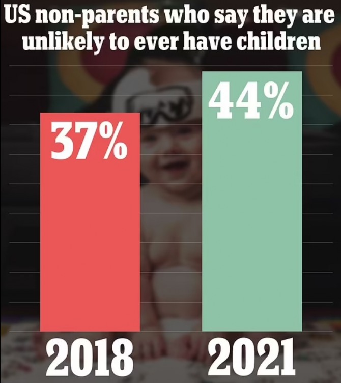 50세 미만의 미국 성인들 사이에서 나온 자녀 출산 계획이 없다는 응답은 퓨리서치센터가 지난 2018년 조사한 결과 비교하면 7%나 증가했다. 이미 부모가 된 성인의 경우에도 4명 중 3명꼴로 자녀를 더 출산할 생각이 없다는 응답이 나왔다.