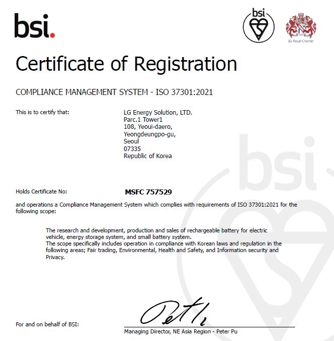 이번 인증 획득으로 LG에너지솔루션은 글로벌 수준 준법 경영시스템을 구축해 준법 리스크를 사전에 식별하고 예방하는 프로세스를 갖췄음을 인정받았다.