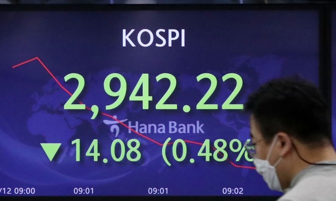 26일 한국거래소에 따르면 코스피는 전날 보다 1.47%(43.83포인트) 떨어진 2936.44에 장을 마감했다.