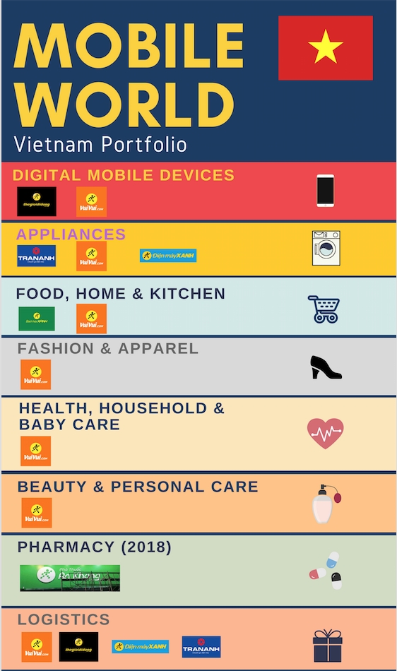 블루지 이전 모바일 월드는 휴대폰 및 전자제품 판매 전문점 모바일 우월드, 전기제품 전문점 띠엔 마이 싸잉, 소비재 전문점 바익화싸잉 등과 같은 수천개의 매장이 있는 여러 체인을 운영하고 있다.