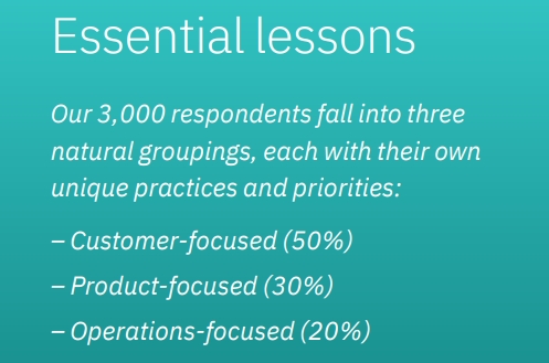 보고서에 따르면 이번 조사에 참여한 CEO들은 대 고객 관계를 최우선으로 생각하는 그룹, 제품 개발을 최우선으로 생각하는 그룹, 기업운영을 최우선으로 생각하는 그룹 등 크게 세가지 유형으로 분류가 됐는데 고객 문제를 가장 중시하는 그룹의 비중이 50%로 가장 많은 것으로 나타났다. 제품 개발 중심적 사고를 하는 그룹은 30%, 조직운영을 중시하는 그룹은 20% 순으로 조사됐다.