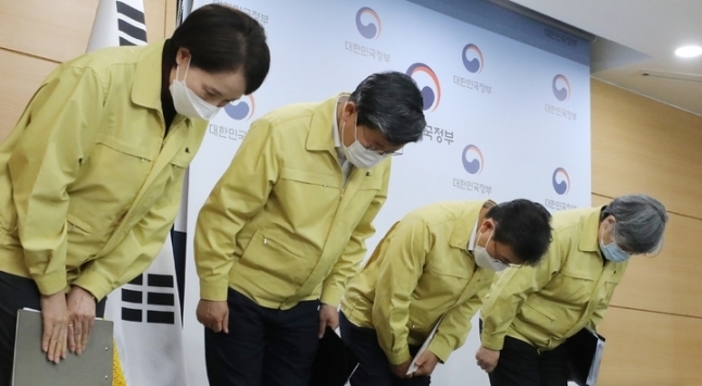 정은경 질병관리청장(오른쪽부터), 권덕철 보건복지부 장관, 전해철 행정안전부 장관, 유은혜 사회부총리 겸 교육부 장관이 29일 서울 종로구 정부서울청사에서 코로나19 대응 특별방역점검회의 관련 합동브리핑을 마친후 인사하고 있다. 사진=뉴시스