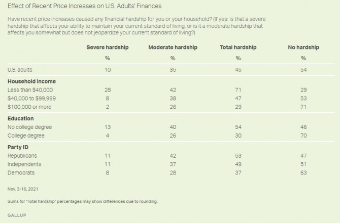 여론조사기관 갤럽이 2일 발표한 여론조사 결과 미국 가구의 45%가 유가 상승과 식료품 가격 상승 등 최근 지속되고 있는 물가 상승의 여파로 가계소비가 어떤 식으로든 위축됐다는 의견을 보였다. 이는 지난달 3~16일 미국 성인 약 1600명을 대상으로 조사한 결과다.