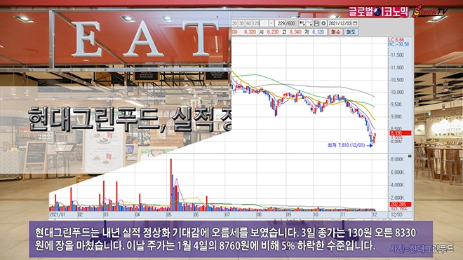 현대그린푸드는 내년 실적 정상화 기대감에 오름세를 보였습니다. 3일 종가는 130원 오른 8330원에 장을 마쳤습니다. 이날 주가는 1월 4일의 8760원에 비해 5% 하락한 수준입니다.