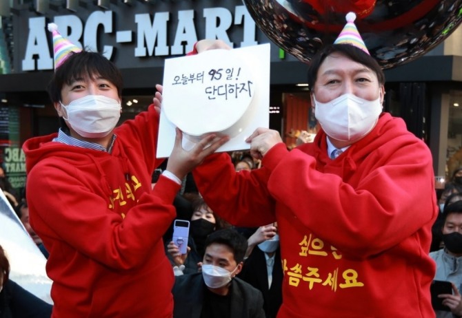 윤 후보와 이 대표는 지난 3일 밤 '울산 담판' 이튿날인 전날 부산 서면 시내 거리에 나란히 등장해 유세를 함께 했다. 윤 후보와 이 대표는 앞 뒷면에 노란색 글씨로 '사진 찍고 싶으면 말씀 주세요', '셀카 모드가 편합니다'라고 적힌 빨간색 후드티를 입고 나왔다.