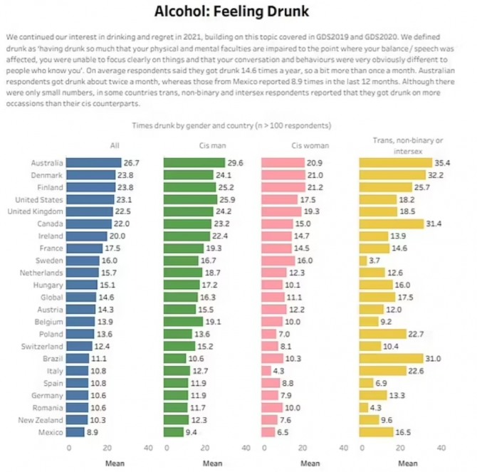 음주 횟수를 기준으로 삼았을 경우에는 프랑스 국민이 연간 132차례 이상 술을 마신다고 밝혀 으뜸을 차지했고 뉴질랜드 국민이 122차례, 네덜란드 국민이 112차례, 헝가리 국민이 109차례, 영국 국민이 107차례 등으로 그 뒤를 이었다. 전체 조사 대상자의 음주 횟수는 평균 101차례였다.