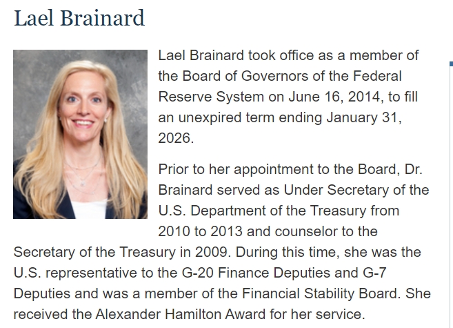 Lael Brainard took office as a member of the Board of Governors of the Federal Reserve System on June 16, 2014, to fill an unexpired term ending January 31, 2026.