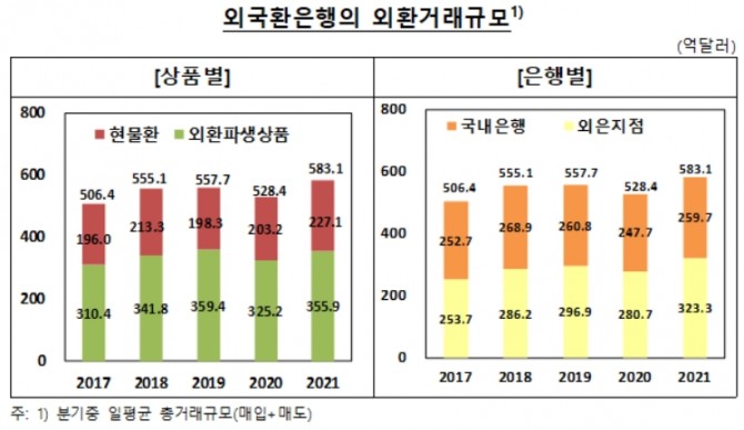 은행별로는 국내은행의 외환거래규모가 259억7000만달러로 전년 대비 4.9%(12억달러) 증가했으며, 외국은행 지점의 외환거래 규모도 323억3000만달러로 15.2%(42억6000만달러) 확대됐다.
