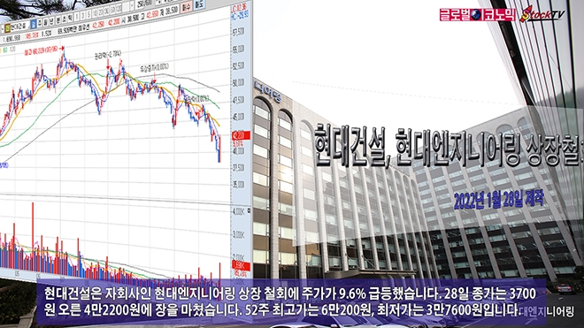 현대건설은 자회사인 현대엔지니어링 상장 철회에 주가가 9.6% 급등했습니다. 28일 종가는 3700원 오른 4만2200원에 장을 마쳤습니다. 52주 최고가는 6만200원, 최저가는 3만7600원입니다.