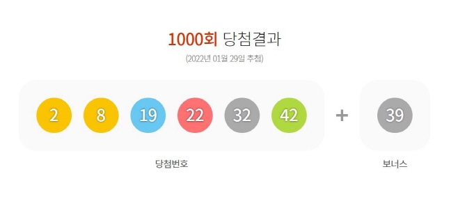 29일 동행복권에 따르면 이날 추첨한 로또 1등 당첨번호는 ‘2, 8, 19, 22, 32, 42’로 나타났다. 2등 보너스 번호는 ‘39’다.