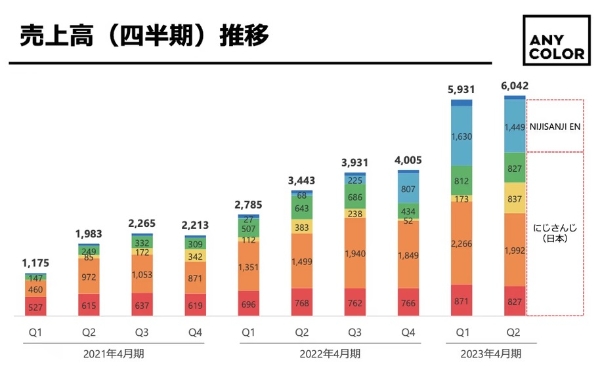 이미지 확대보기2분기 실적 면에서 가장 큰 성장세를 보인 것은 영어권 지부 '니지산지EN(잉글리시)'이다. 지난해 2분기 6800만엔대(약 6억5200만원) 매출을 기록했으나 1년만에 14억엔(약 139억원)으로 21배 급상승했다.
