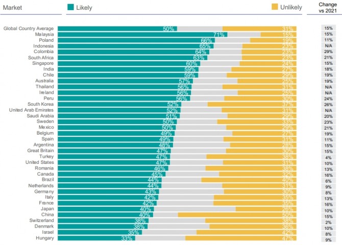 말레이시아 다음으로 유럽의 폴란드가 66%로 2위, 아시아의 인도네시아가 65%로 3위, 남미의 콜롬비아가 64%로 4위, 아프리카의 남아프리카공화국이 63%로 5위를 각각 기록한 것으로 나타났다.