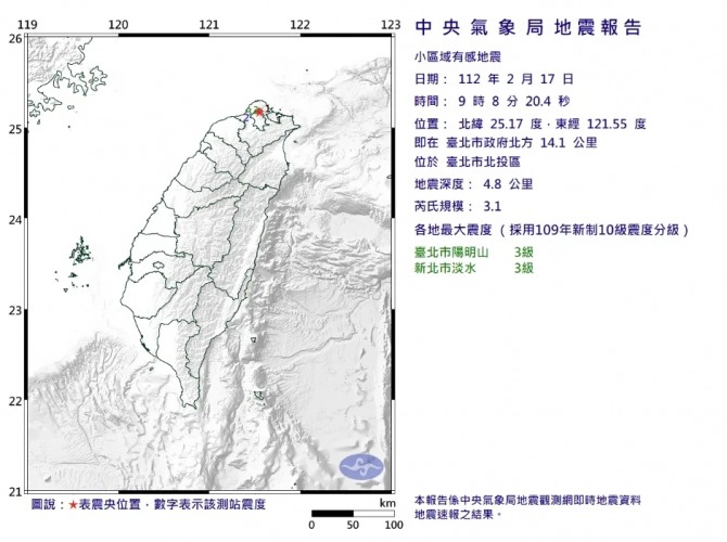 타이베이시, 신베이시와 신주시 등에서 관측된 지진 규모는 3.0이다.